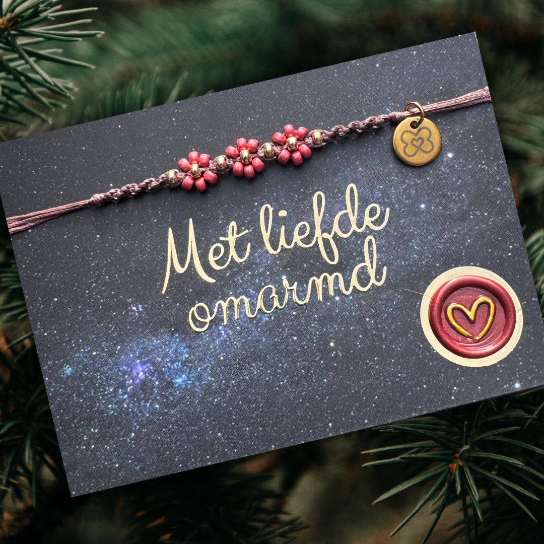 Dankzij het schuifknoopje past dit armbandje altijd mooi om elke pols. Verpakt op een kaartje met letters van goudfolie en verzegeld met een rode wasstempel met hartje als een zegel van liefde.
